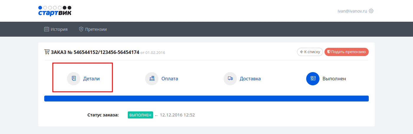 12. Открывается страница "История", в которой отражается мой заказ в Стартвик. Нажимаю "Подробнее".