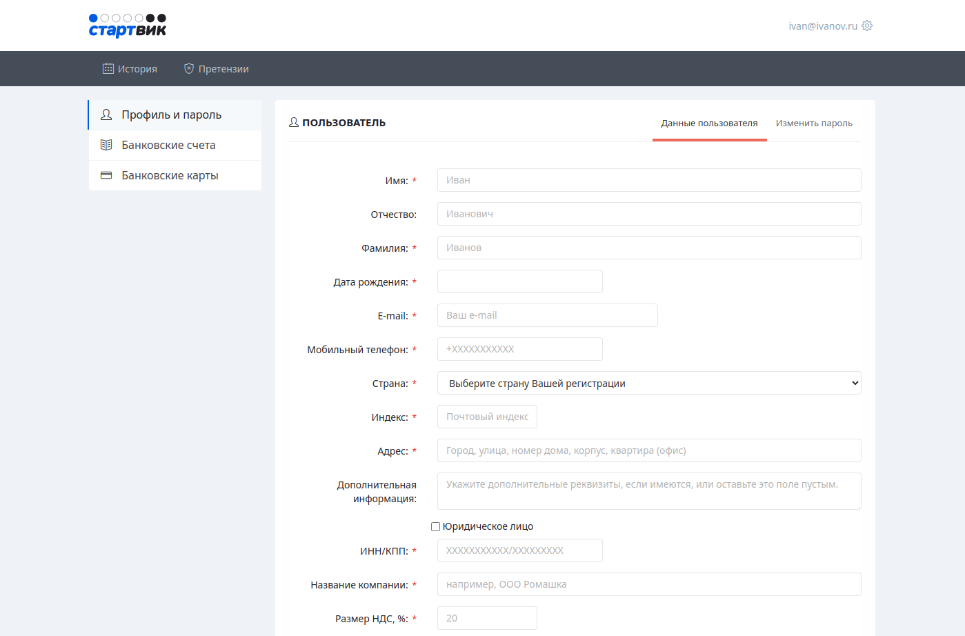 7. Открывается Анкета пользователя Стартвик. Заполняю данные директора и реквизиты компании.