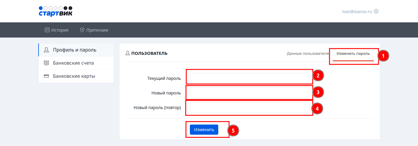 3. Перейдите на вкладку "Изменить пароль". Укажите свой текущий пароль, новый пароль и повторно новый пароль. Нажмите "Изменить"