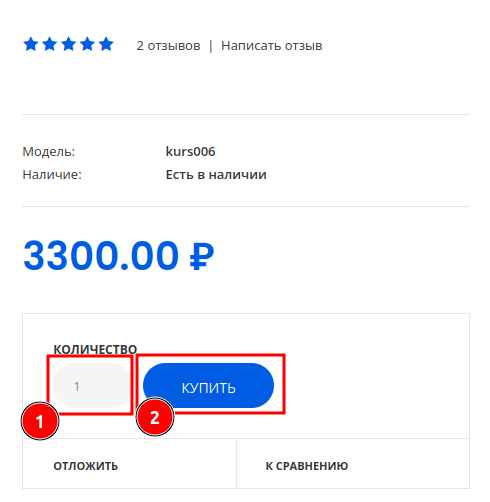- Укажите количество (1) и добавьте интересующий Вас товар в корзину, нажав (2) значок "Купить" на странице