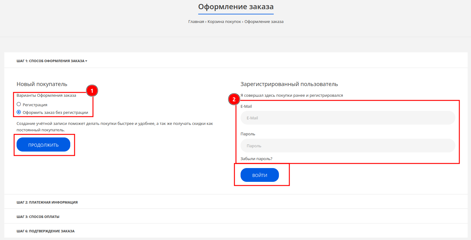 Если вы впервые совершаете покупки в нашем магазине, Вы можете оформить заказ без регистрации (1). Выберите