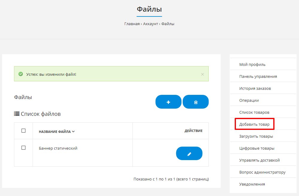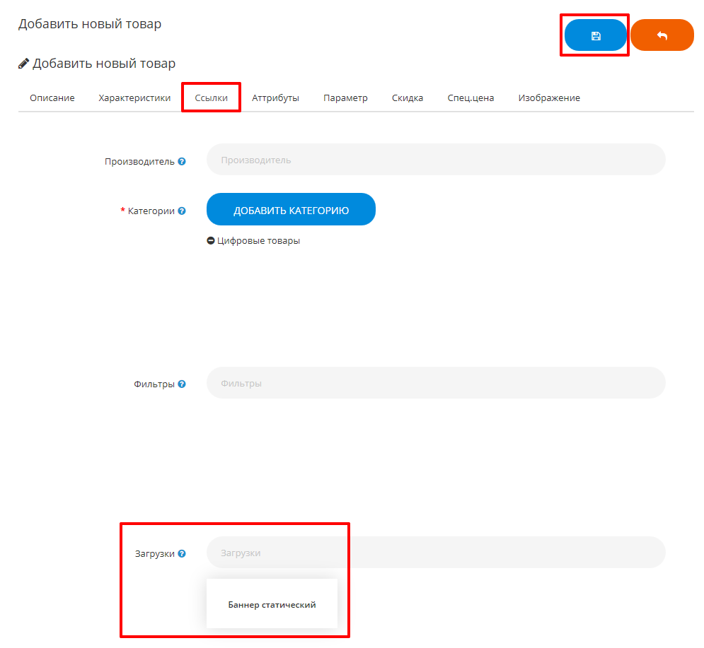 В поле "Загрузки" выберите загруженный товар. Сохраните.