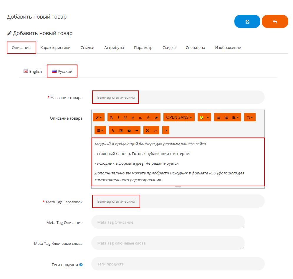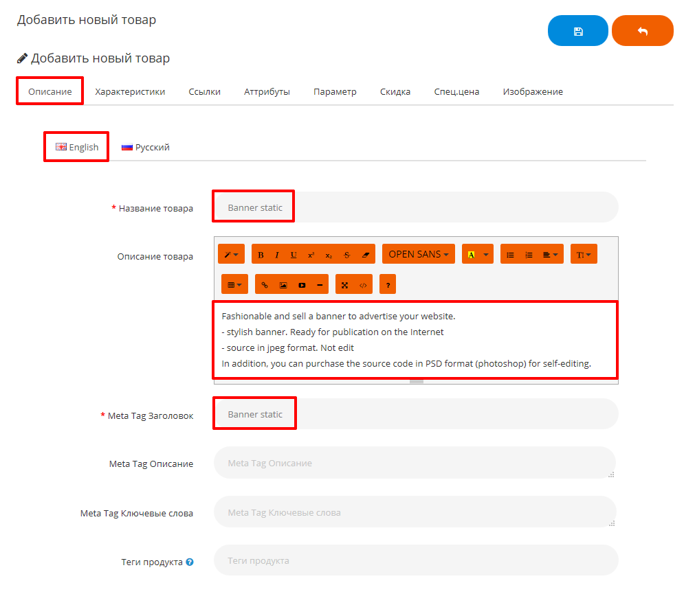 Так же заполните данные товара на английском языке. Если вы не предполагаете продажу товара/услуги иностранным покупателям, продублируйте данные на русском языке.