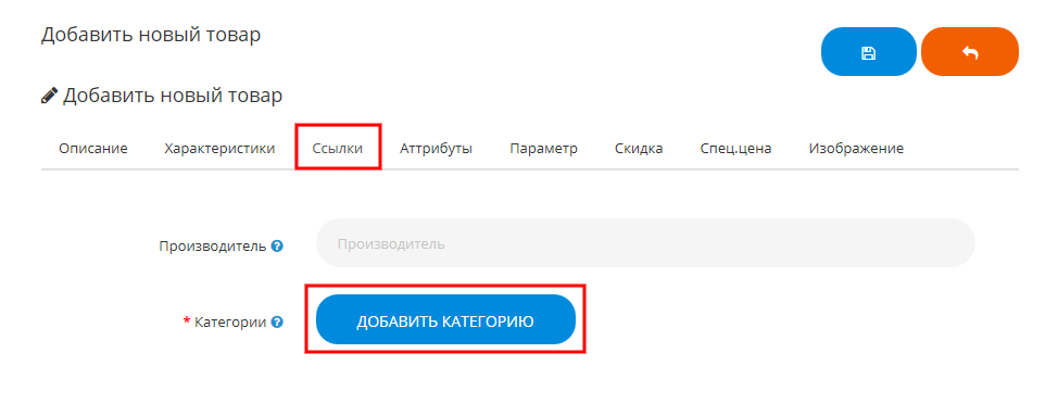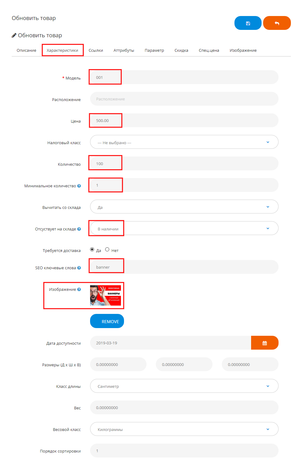 Перейдите на вкладку "Характеристики". Заполните обязательные данные товара. Обязательно заполните поле "SEO ключевые слова".