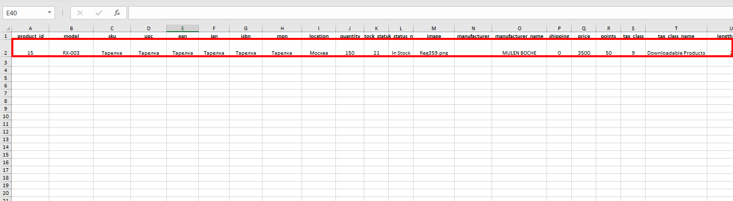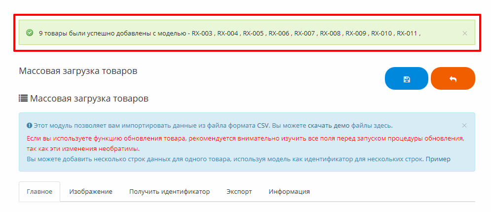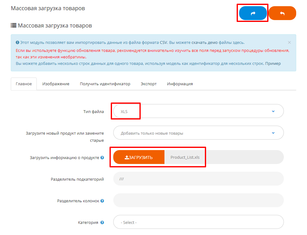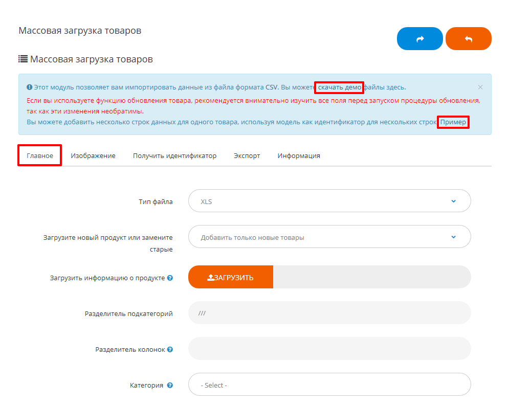 Модуль загрузки и обновления товаров позволяет импортировать данные из файлов формата XSL. Скачайте демо файл для изучения структуры данных и полей. Ознакомьтесь с примером.