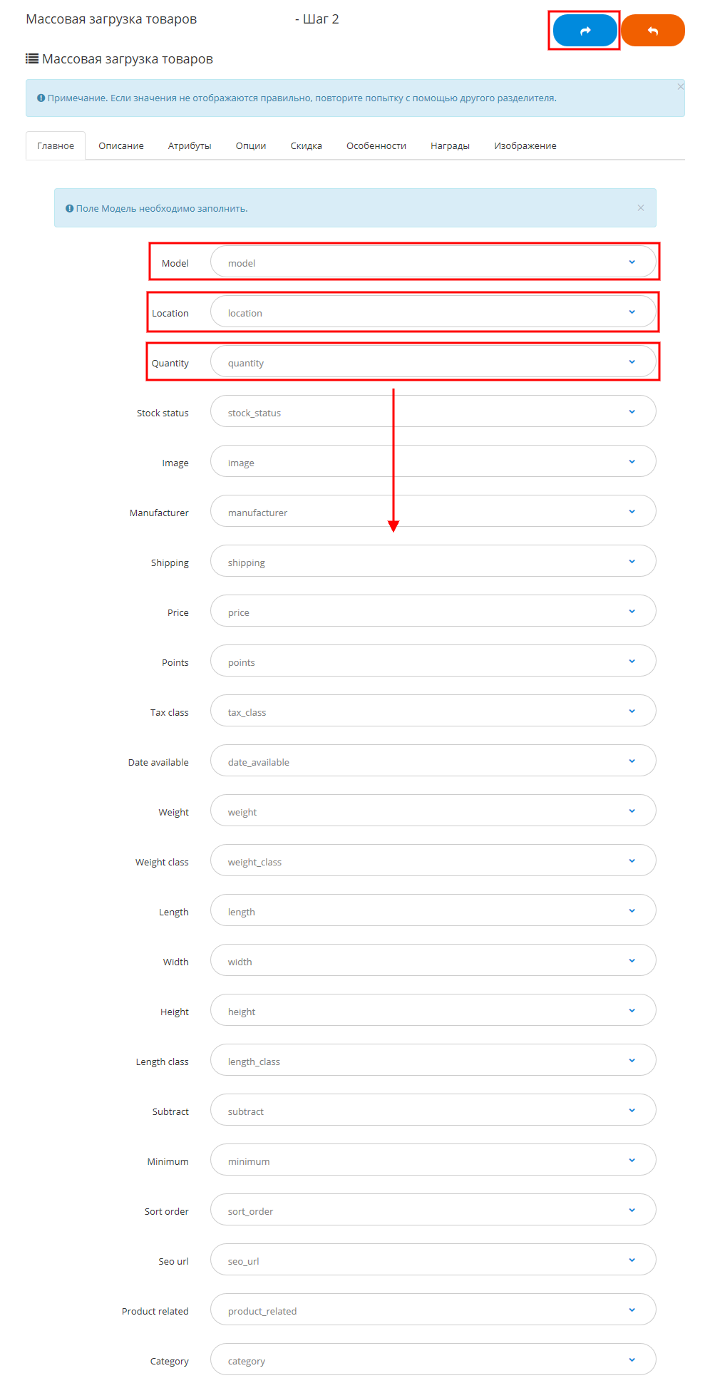 Проверьте соответствие значений и полей. Нажмите кнопку "Далее".