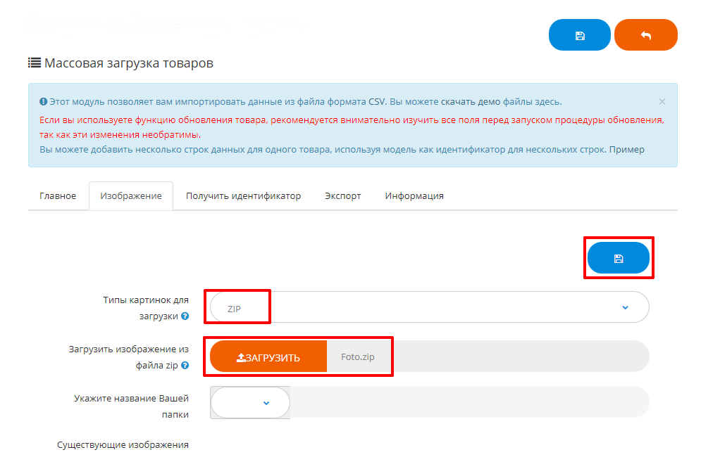 Откройте вкладку "Изображение". Заархивируйте ваши изображения архиватором (формат zip). Загрузите созданный файл. Нажмите "Сохранить".