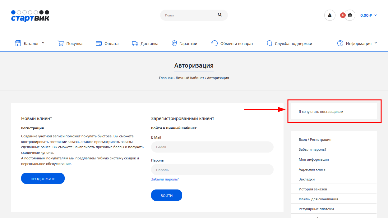 Откроется страница входа для пользователей Стартвик. Выберите в боковом меню пункт "Я хочу стать поставщиком".