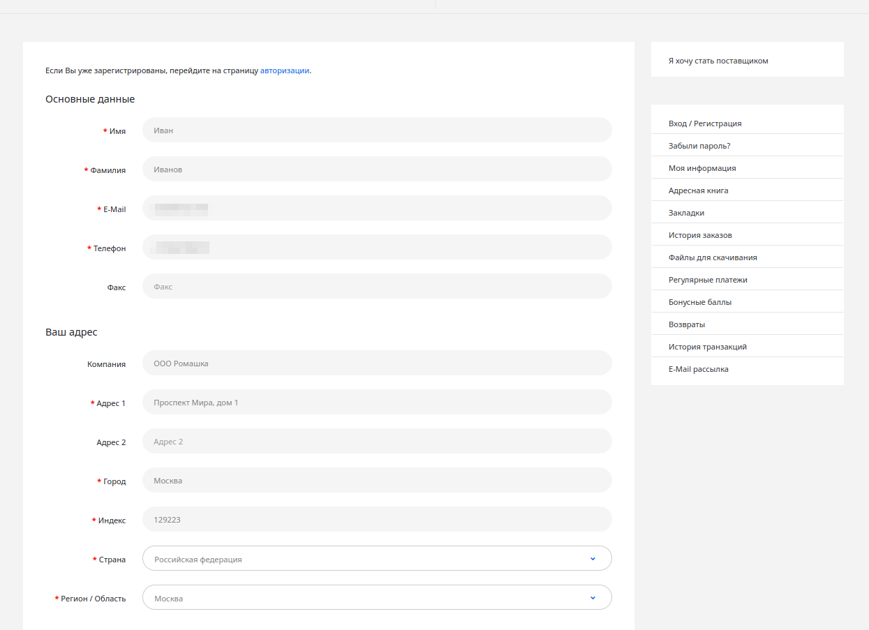 Регистрация происходит мгновенно. Если форма была заполнена верно, то Вы увидите следующую страницу.