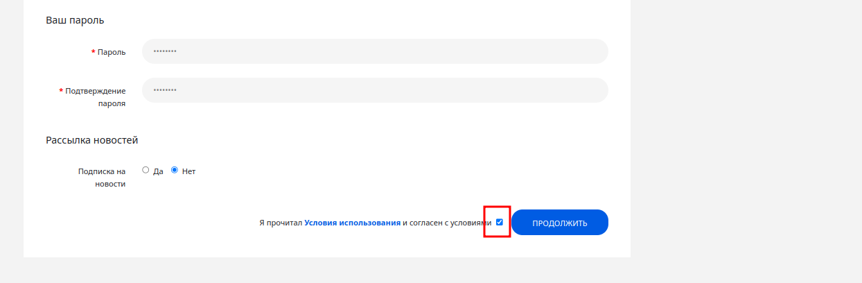 Перед тем как нажать кнопку "Продолжить", поставьте галочку что согласны с условиями Стартвик. Это условия для всех пользователей Стартвик, независимо от статуса.