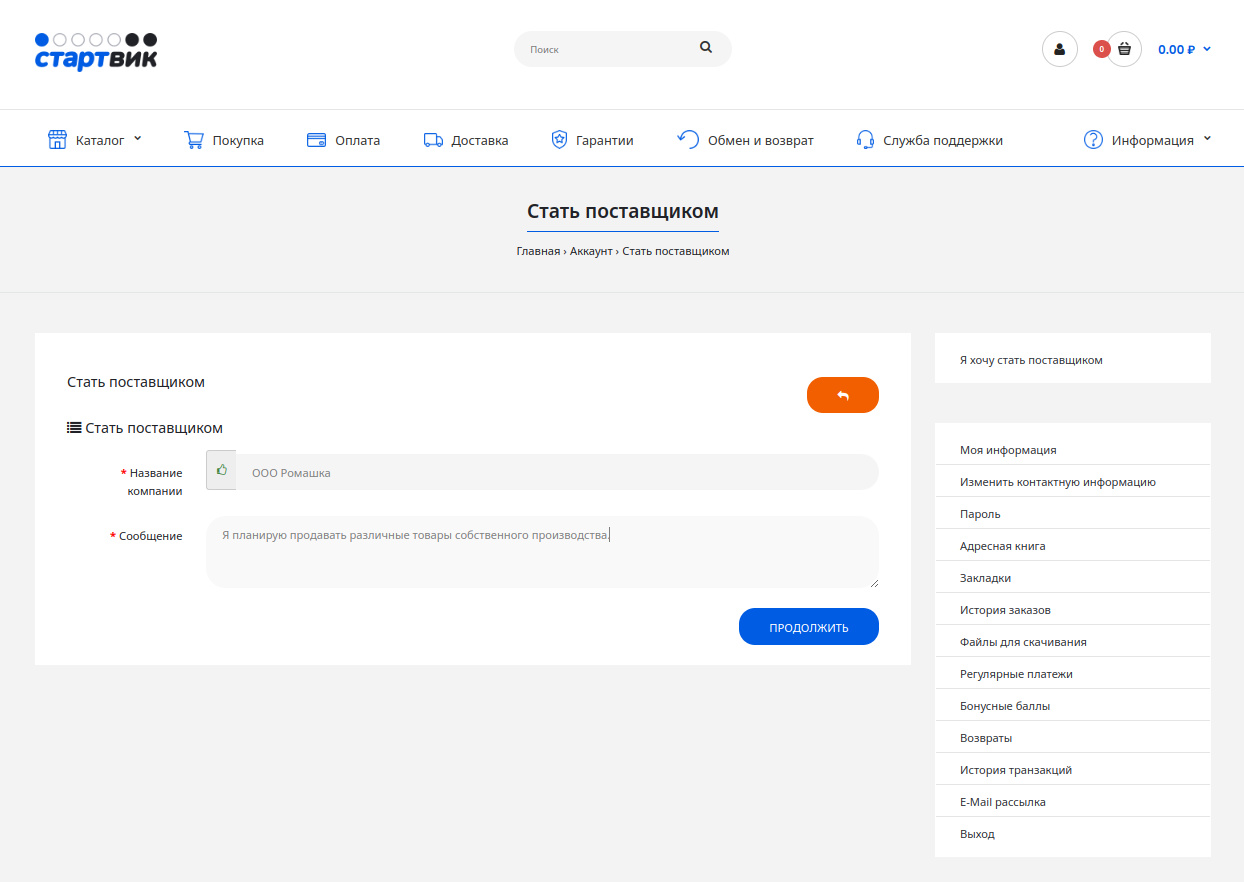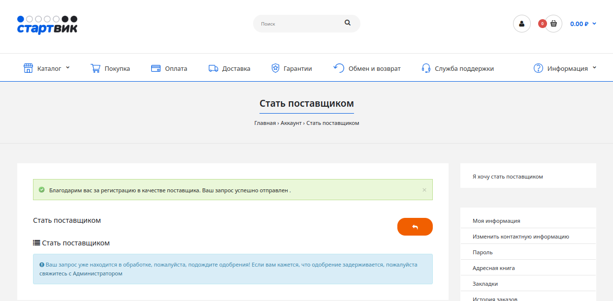 Теперь Вы можете оформить запрос на получение статуса поставщика Стартвик. Нажмите на пункт "Я хочу стать поставщиком".
